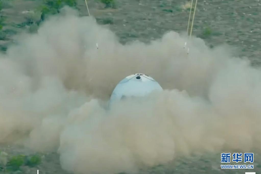 這張美國藍色起源公司7月20日發布的視頻截圖顯示“新謝潑德”飛行器在美國得克薩斯州西部著陸。