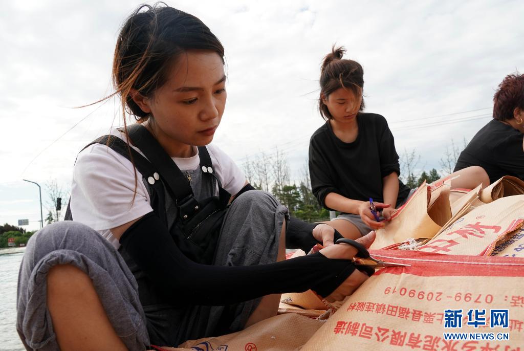 當日,在河南省鶴壁市浚縣傅莊堤上,不少群眾自發前來和救援人員一起裝沙袋、運沙袋,共筑堤壩。受持續強降雨影響,浚縣防汛形勢嚴峻,傅莊堤主要為??h縣城及26個村莊提供保護。新華社記者 李安 攝