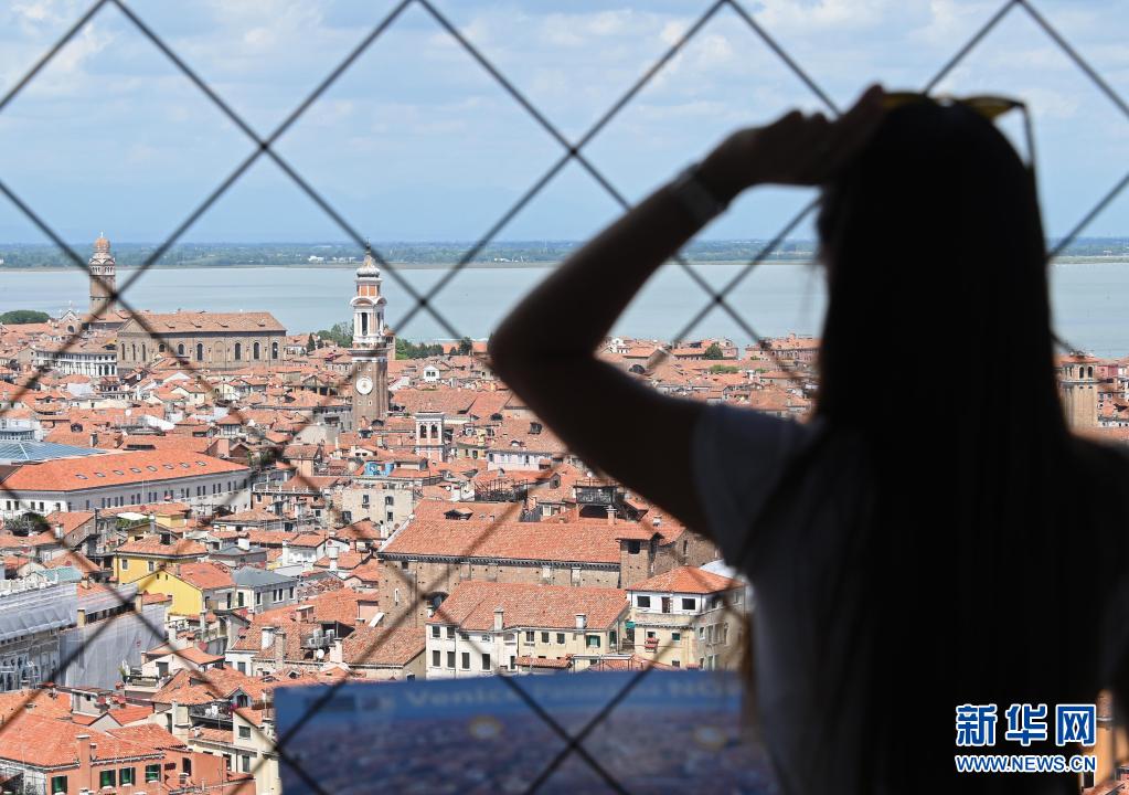 8月3日,一名游客在意大利威尼斯圣馬可廣場的鐘樓上俯瞰威尼斯。