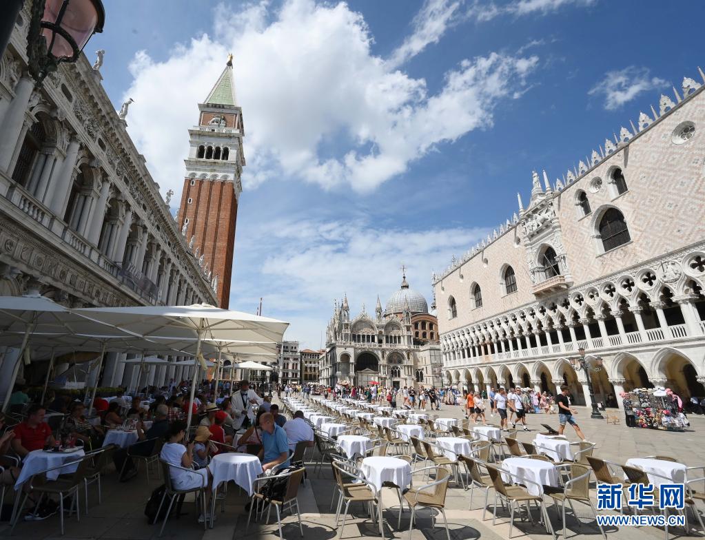 8月3日,游客在意大利威尼斯一處餐廳的戶外就餐區消費。