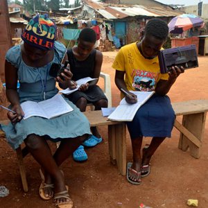 8月16日,學生在烏干達首都坎帕拉用收音機收聽無線電廣播的教學內容。