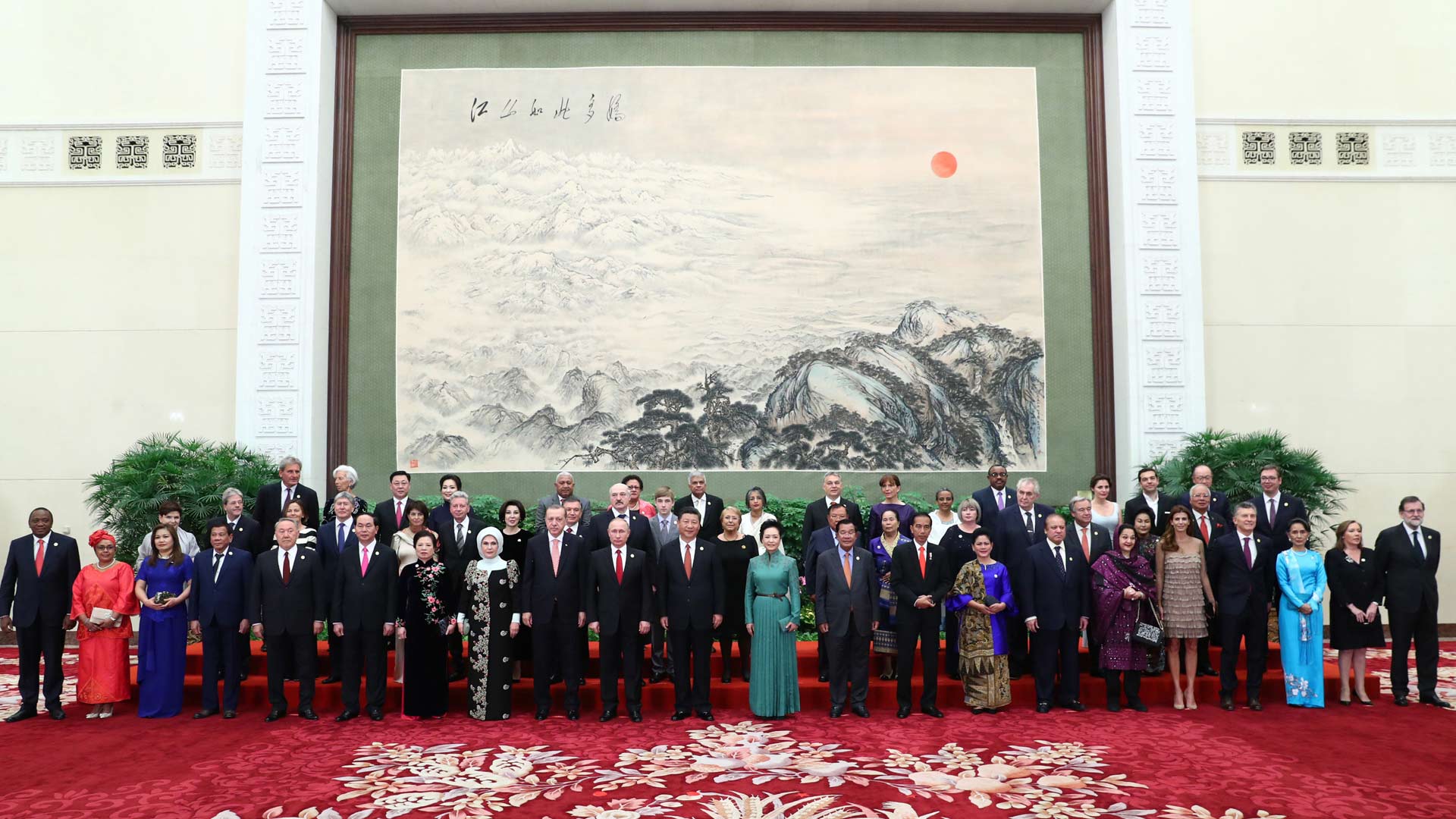 5月14日,國家主席習(xí)近平在北京人民大會堂舉行宴會,歡迎出席“一帶一路”國際合作高峰論壇的外方代表團團長及嘉賓。這是習(xí)近平和夫人彭麗媛同外方代表團團長及配偶集體合影留念。新華社記者 謝環(huán)馳 攝