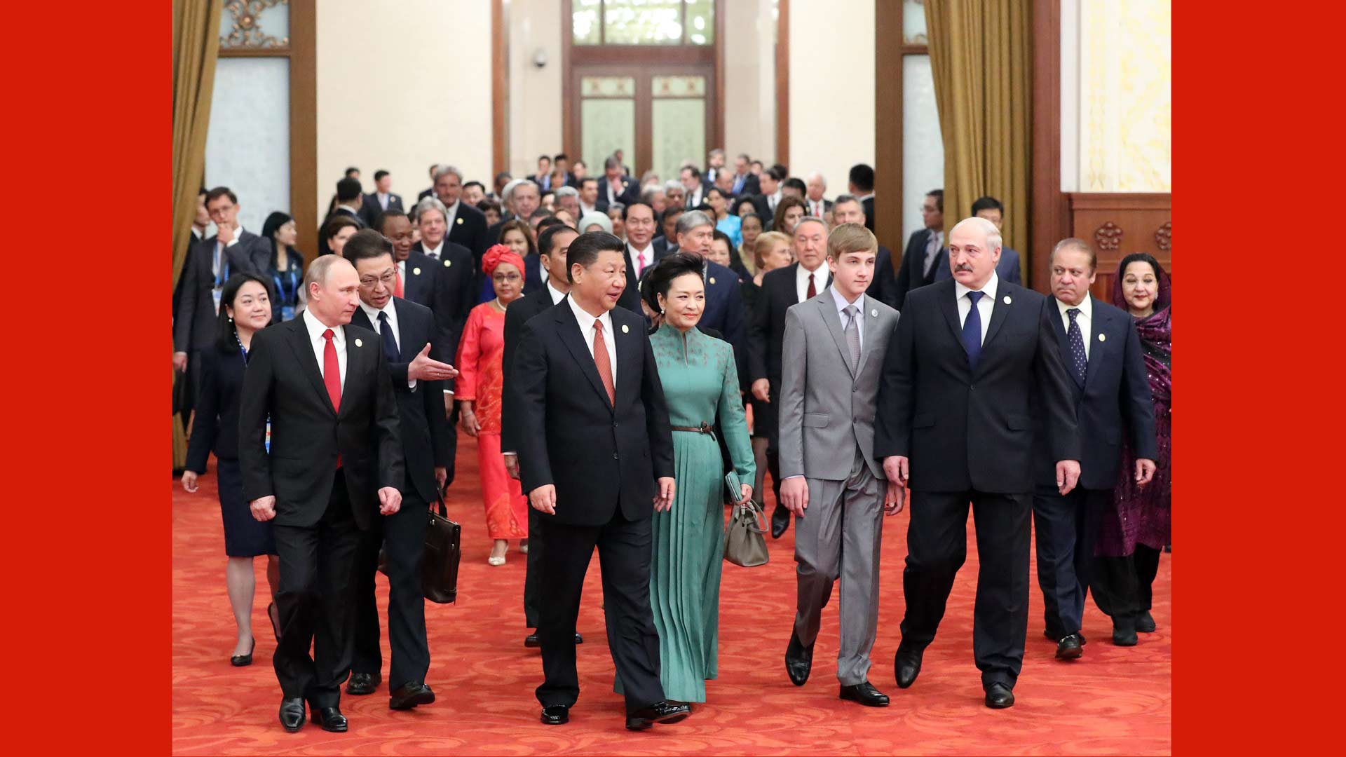 5月14日,國家主席習(xí)近平在北京人民大會堂舉行宴會,歡迎出席“一帶一路”國際合作高峰論壇的外方代表團團長及嘉賓。這是習(xí)近平和夫人彭麗媛同貴賓們一同步入宴會廳。新華社記者 劉衛(wèi)兵 攝