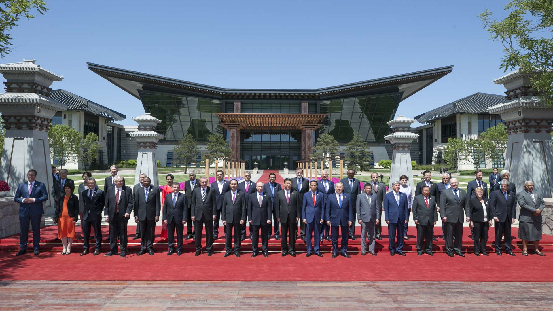 5月15日,“一帶一路”國際合作高峰論壇圓桌峰會在北京雁棲湖國際會議中心舉行,國家主席習(xí)近平主持會議并致開幕辭。這是第一階段會議結(jié)束后,習(xí)近平同外方代表團團長及嘉賓在雁棲湖國際會議中心前合影。新華社記者 姚大偉 攝