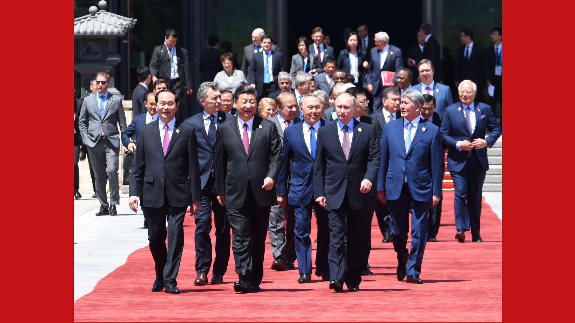 5月15日,“一帶一路”國際合作高峰論壇圓桌峰會在北京雁棲湖國際會議中心舉行,國家主席習(xí)近平主持會議并致開幕辭。這是第一階段會議結(jié)束后,習(xí)近平同外方代表團團長及嘉賓步出雁棲湖國際會議中心。新華社記者 饒愛民 攝