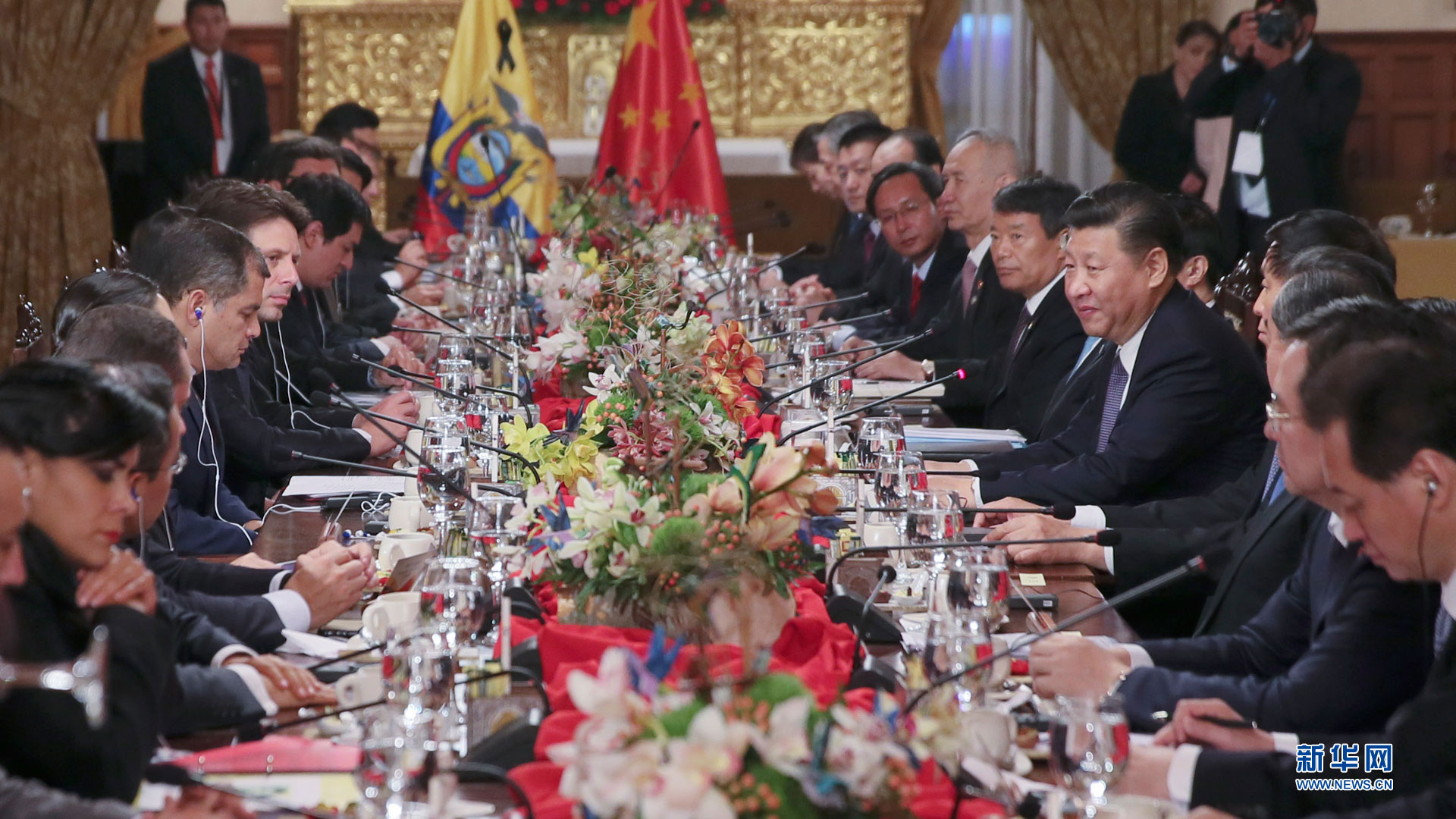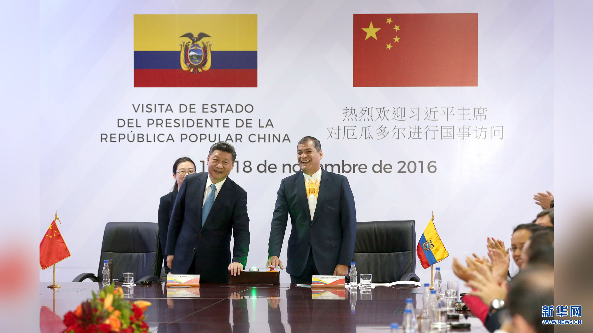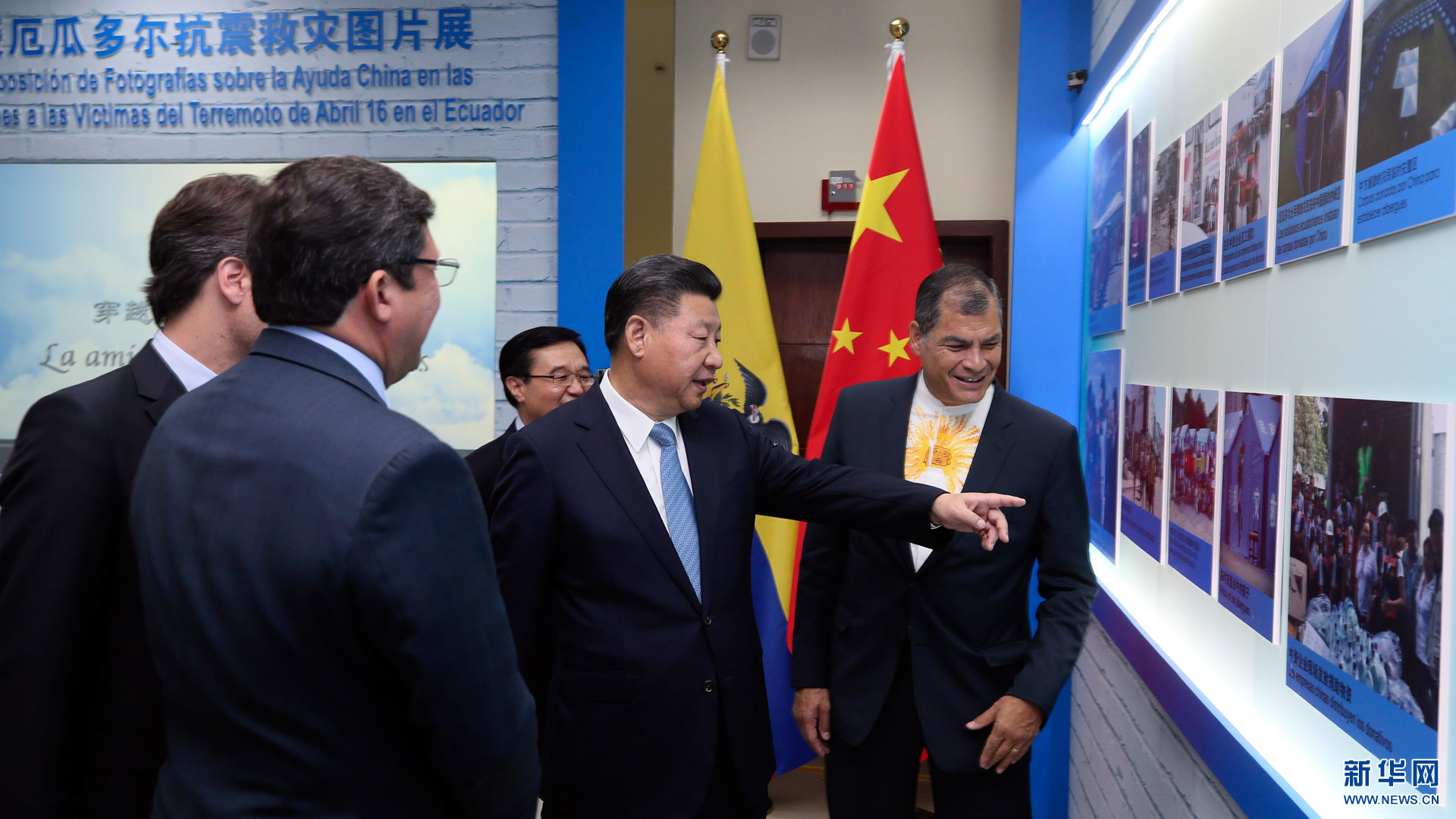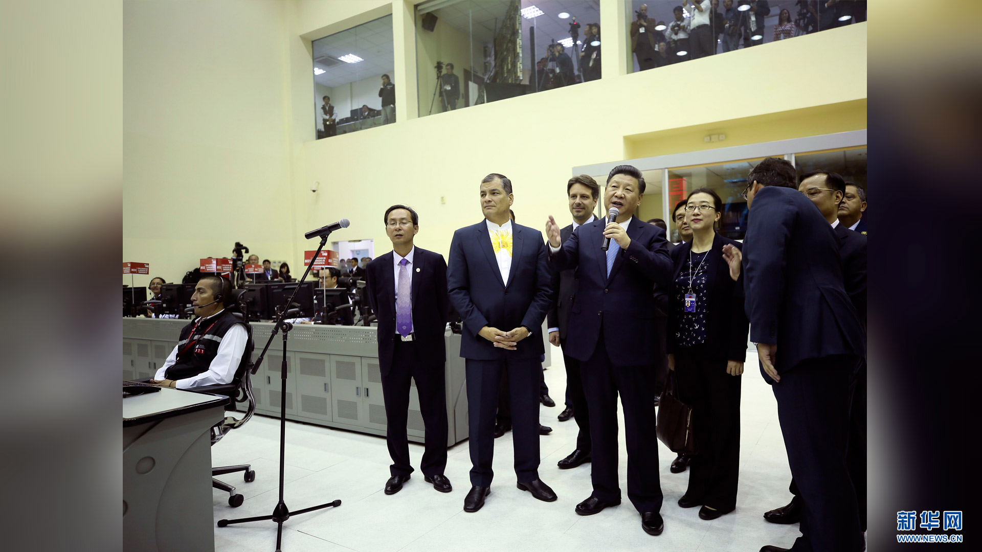 當(dāng)?shù)貢r間11月18日,國家主席習(xí)近平在基多同厄瓜多爾總統(tǒng)科雷亞共同出席中方援建的厄瓜多爾公共安全應(yīng)急指揮中心聯(lián)合實驗室揭牌儀式,喬內(nèi)醫(yī)院奠基、科卡科多-辛克雷水電站竣工發(fā)電視頻連線活動。這是習(xí)近平通過視頻連線向地震災(zāi)區(qū)波多維耶霍指揮中心當(dāng)?shù)貑T工致以親切問候,向地震災(zāi)害中獲救者表達(dá)慰問和祝福。新華社記者 蘭紅光 攝2016-11-19