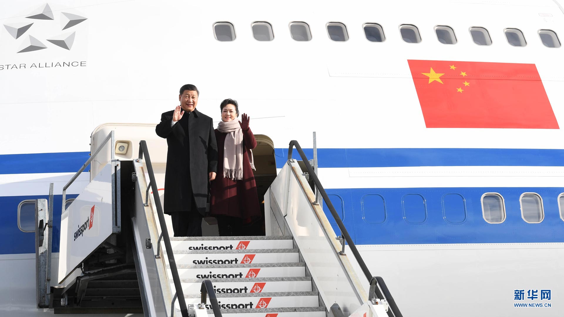 1月15日,國家主席習近平乘專機抵達蘇黎世,開始對瑞士聯邦進行國事訪問。 這是習近平和夫人彭麗媛步出艙門。新華社記者饒愛民攝2017-01-16