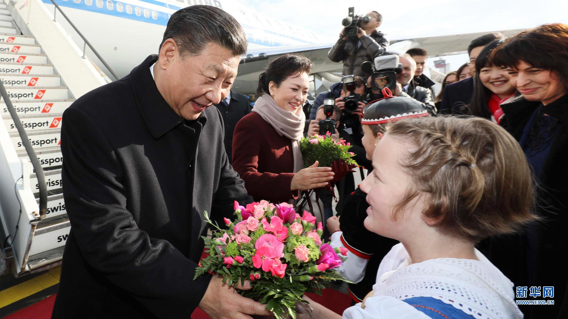 1月15日,國家主席習近平乘專機抵達蘇黎世,開始對瑞士聯邦進行國事訪問。這是當地兒童向習近平和夫人彭麗媛獻上鮮花。新華社記者蘭紅光攝2017-01-16