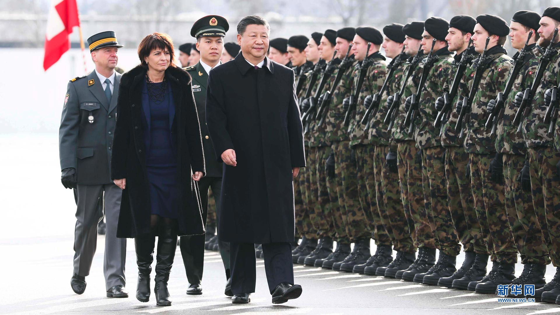 1月15日,國家主席習近平乘專機抵達蘇黎世,開始對瑞士聯邦進行國事訪問。這是習近平在瑞士聯邦主席洛伊特哈德陪同下檢閱儀仗隊。新華社記者蘭紅光攝2017-01-16