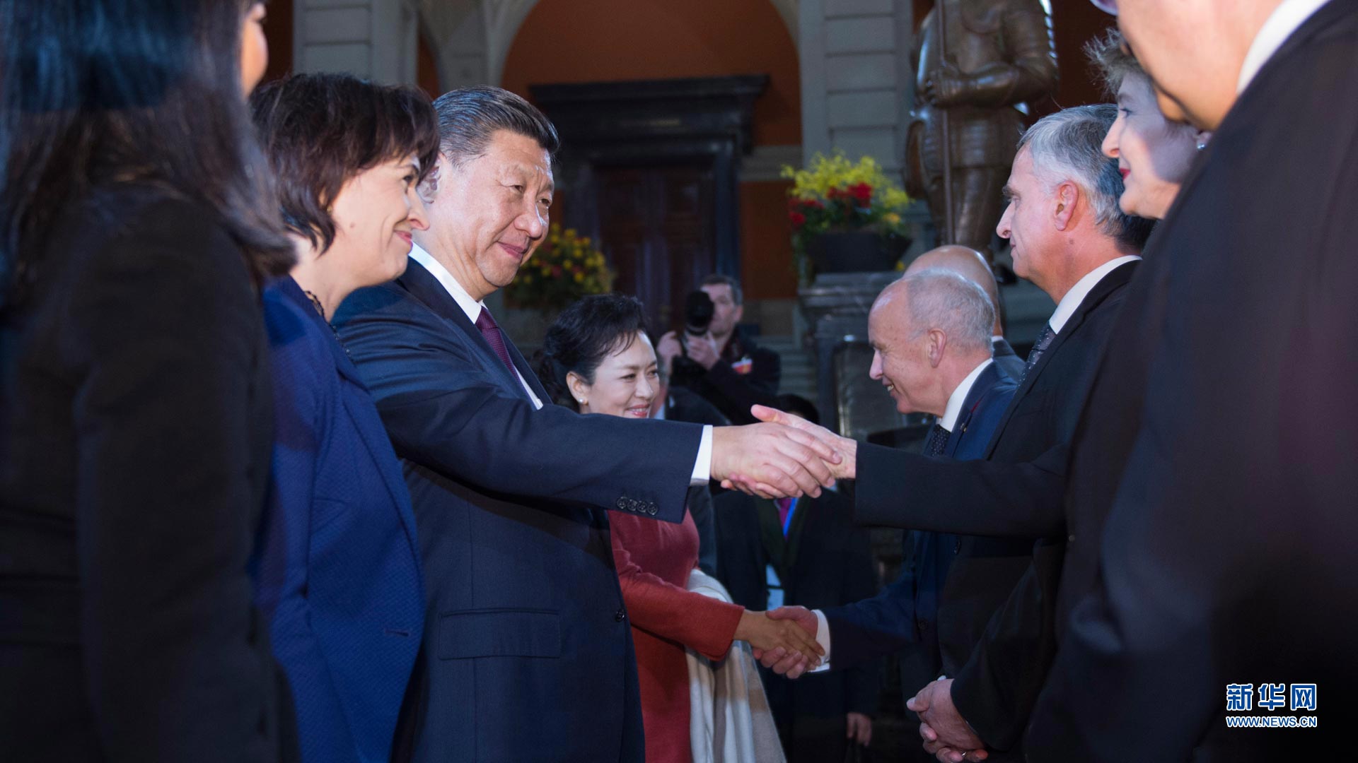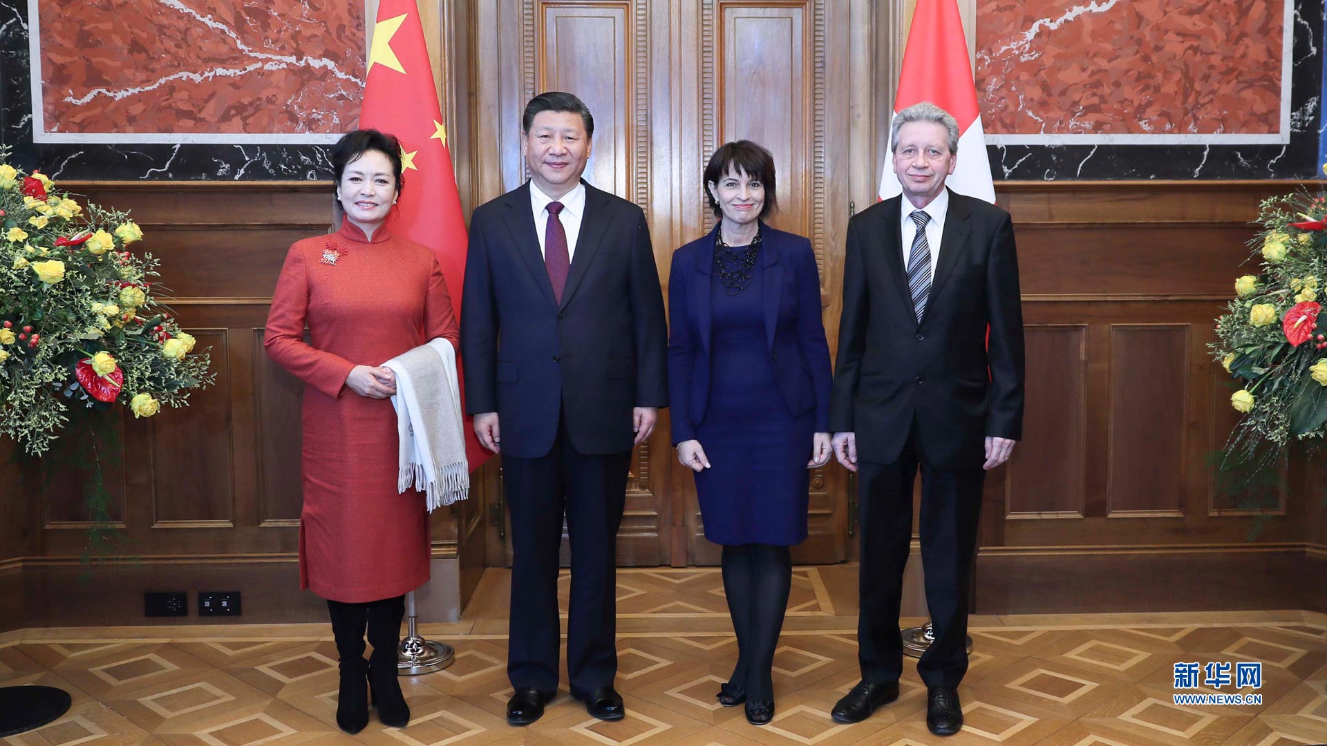 1月15日,國家主席習近平在伯爾尼出席瑞士聯邦委員會全體委員集體舉行的迎接儀式并致辭。這是瑞士聯邦主席洛伊特哈德夫婦在聯邦大廈迎接習近平和夫人彭麗媛。 新華社記者蘭紅光攝2017-01-16