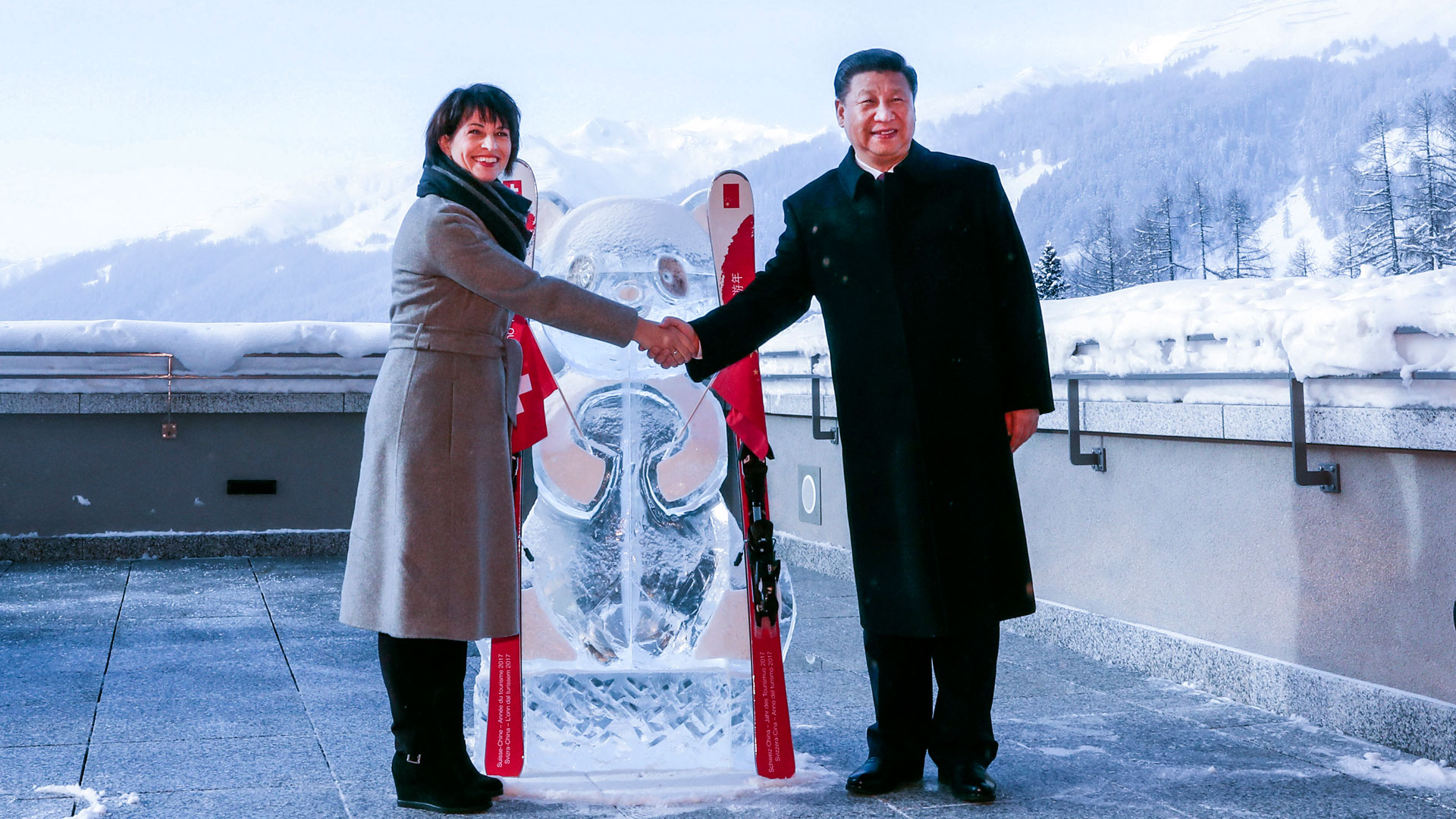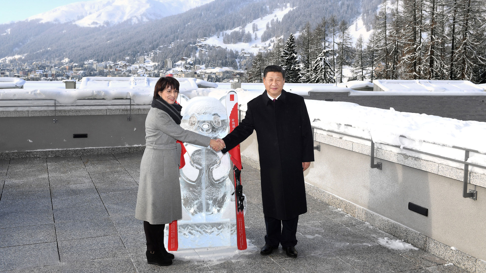1月17日,國家主席習近平同瑞士聯邦主席洛伊特哈德在達沃斯共同啟動中瑞旅游年。兩國元首在熊貓冰雕像和印有中瑞兩國國旗及“中瑞旅游年”字樣的滑雪板旁合影留念。新華社記者 饒愛民 攝2017-01-18