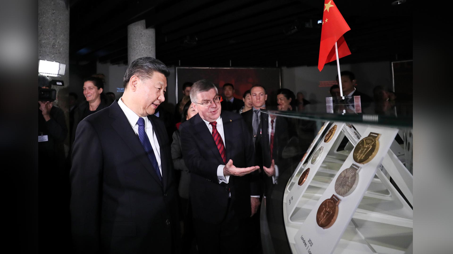 1月18日,國家主席習近平在瑞士洛桑國際奧林匹克博物館會見國際奧林匹克委員會主席巴赫。這是會見后,習近平在巴赫陪同下參觀往屆奧運會獎牌展。新華社記者 蘭紅光 攝2017-01-19