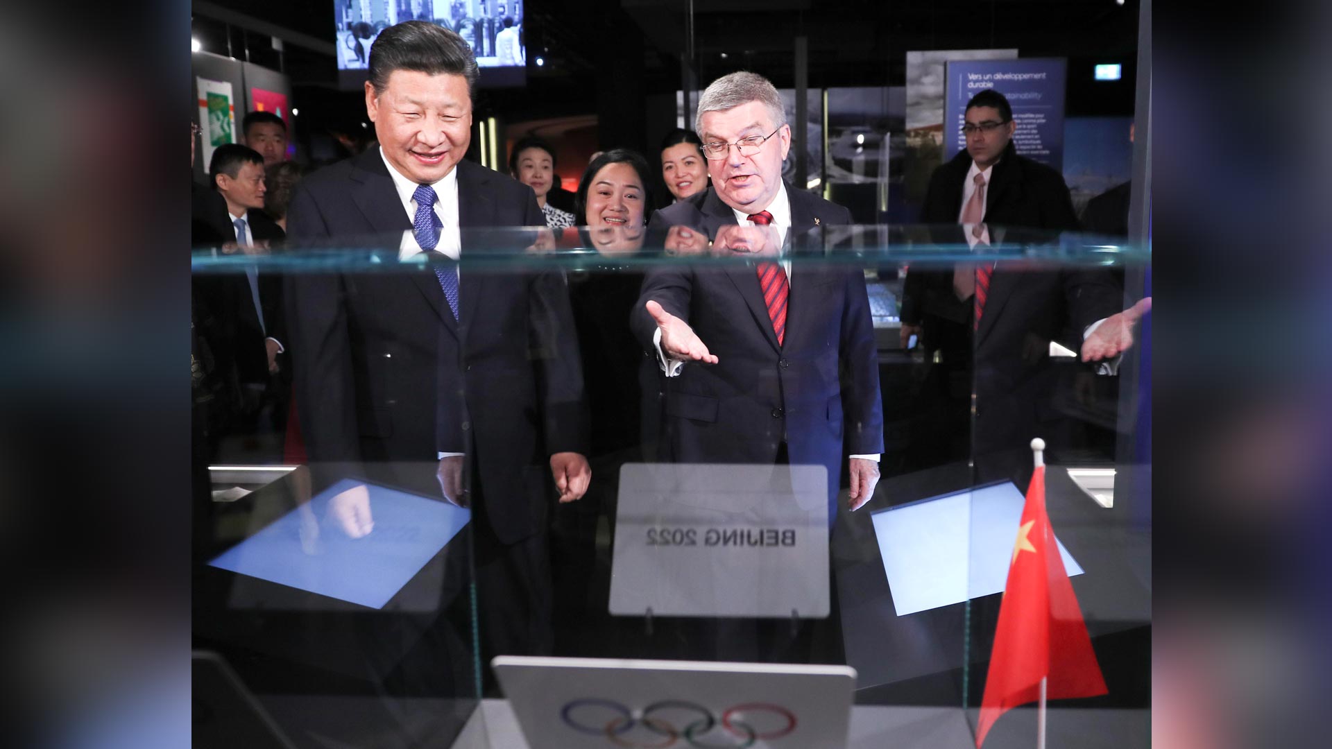 1月18日,國家主席習近平在瑞士洛桑國際奧林匹克博物館會見國際奧林匹克委員會主席巴赫。這是巴赫向習近平介紹他宣布北京獲得2022年冬季奧運會舉辦權時用的牌子。新華社記者 蘭紅光 攝2017-01-19