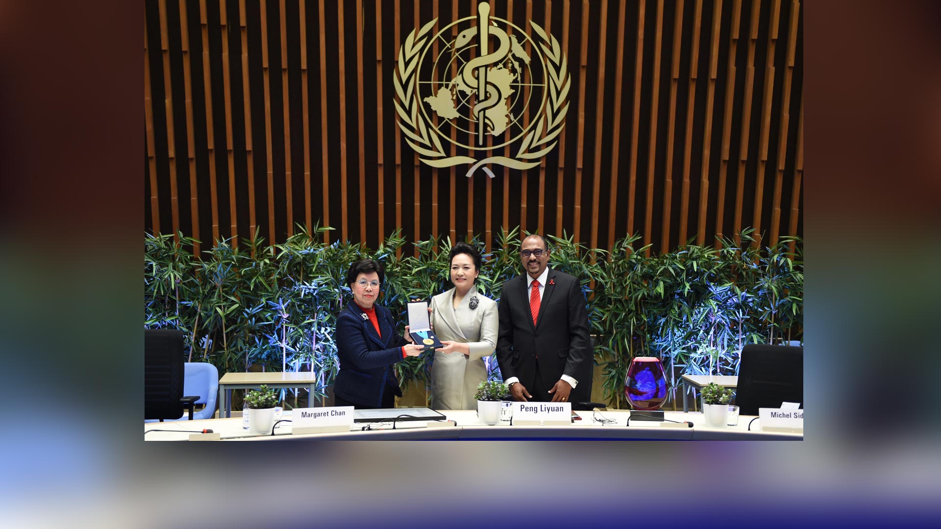 1月18日,國家主席習近平夫人、世界衛生組織結核病和艾滋病防治親善大使彭麗媛應世界衛生組織總干事陳馮富珍和聯合國艾滋病規劃署執行主任西迪貝邀請,在瑞士日內瓦出席為她舉行的親善大使任期續延暨頒獎儀式。這是世界衛生組織總干事陳馮富珍向彭麗媛頒發世衛組織榮譽勛章。新華社記者謝環馳攝2017-01-19