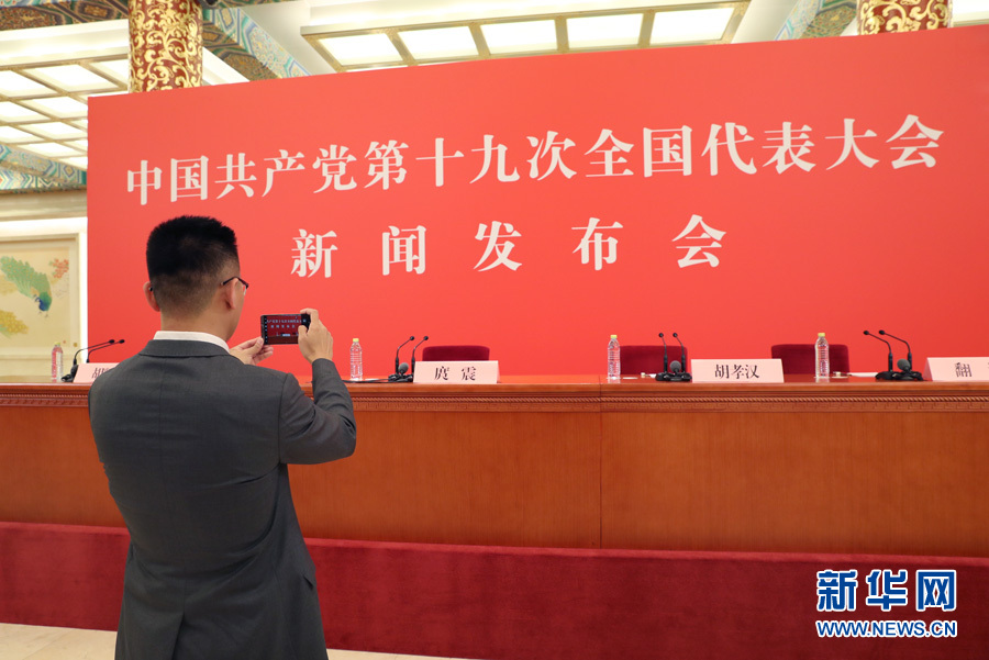 2017年10月17日下午,中國共產(chǎn)黨第十九次全國代表大會(huì)新聞發(fā)言人在人民大會(huì)堂三樓金色大廳舉行新聞發(fā)布會(huì),并回答中外記者提問。圖為記者在新聞發(fā)布會(huì)現(xiàn)場(chǎng)拍攝。新華網(wǎng) 翟子赫 攝