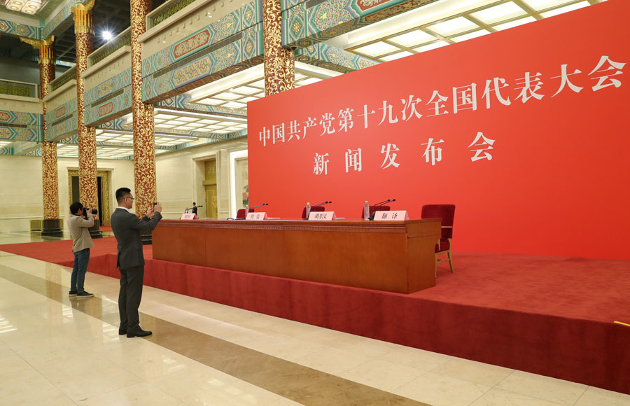 2017年10月17日下午,中國共產(chǎn)黨第十九次全國代表大會新聞發(fā)言人在人民大會堂三樓金色大廳舉行新聞發(fā)布會,并回答中外記者的提問。圖為記者在現(xiàn)場拍攝。新華網(wǎng) 翟子赫 攝
