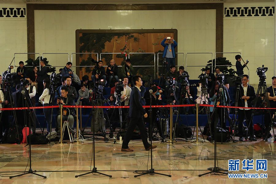 10月19日,“黨代表通道”第二場(chǎng)采訪活動(dòng)在人民大會(huì)堂舉行。圖為現(xiàn)場(chǎng)媒體記者正在做采訪準(zhǔn)備。新華網(wǎng) 翟子赫 攝