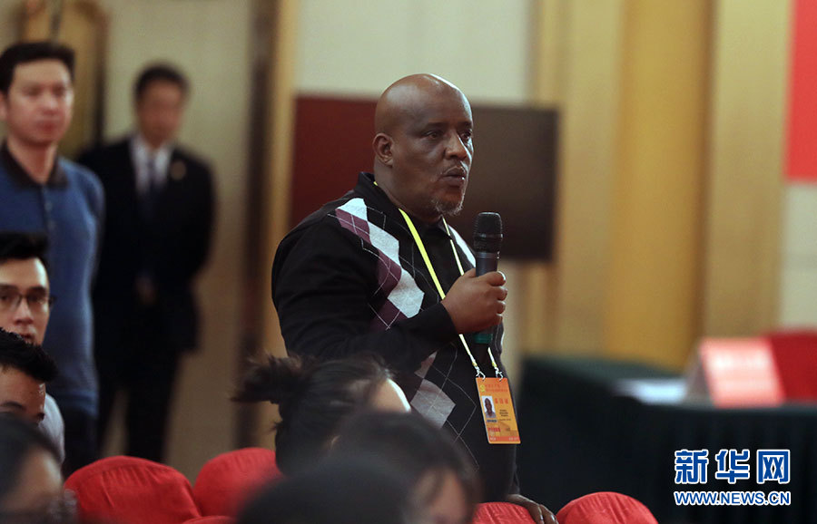 ??? 10月19日,十九大新聞中心舉辦集體采訪,邀請政法戰線代表談全面推進依法治國。圖為肯尼亞記者提問。新華網 郝廣鵬攝