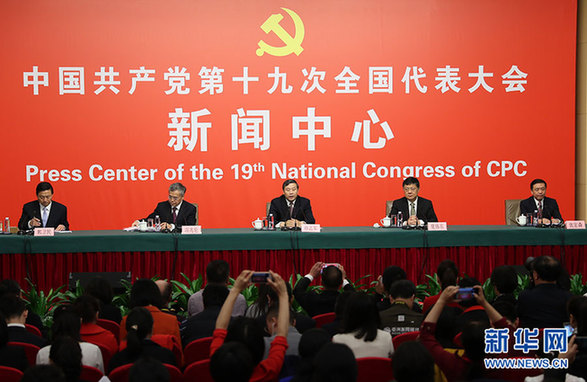 10月20日,十九大新聞中心舉行記者會,邀請中宣部、中央文明辦、文化部、新聞出版廣電總局相關負責人介紹加強思想道德和文化建設情況,并回答記者提問。圖為記者會現場。新華網 郝廣鵬 攝