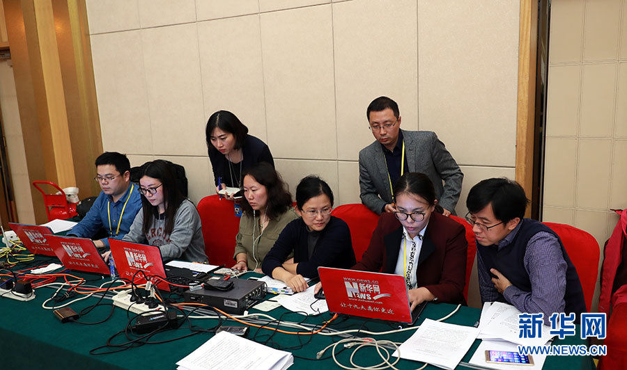 ??? 10月20日,十九大新聞中心舉辦集體采訪活動(dòng),主題為“實(shí)施創(chuàng)新驅(qū)動(dòng)發(fā)展戰(zhàn)略”。圖為新華網(wǎng)在現(xiàn)場(chǎng)直播。新華網(wǎng) 郝廣鵬攝