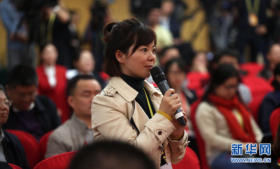 ??? 10月20日,十九大新聞中心舉辦集體采訪活動(dòng),主題為“實(shí)施創(chuàng)新驅(qū)動(dòng)發(fā)展戰(zhàn)略”。圖為科技日?qǐng)?bào)中國(guó)科技網(wǎng)記者提問。新華網(wǎng) 郝廣鵬攝