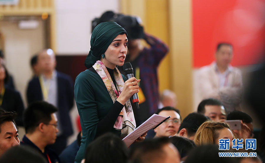 10月22日,十九大新聞中心在梅地亞中心二層新聞發(fā)布廳舉辦集體采訪活動,主題為“中國特色強軍之路邁出堅定步伐”。圖為迪拜中阿衛(wèi)視記者提問。新華網(wǎng) 郝廣鵬攝