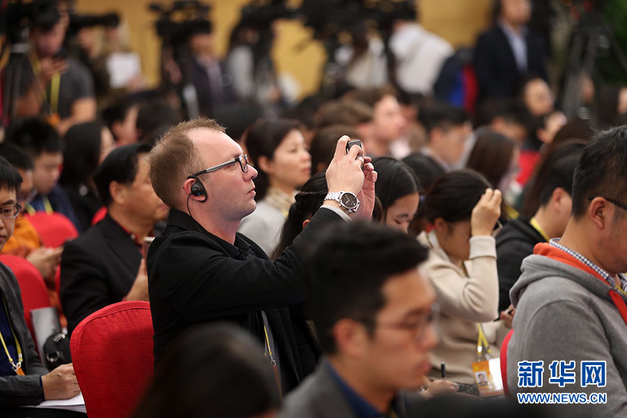 10月23日,十九大新聞中心舉辦記者招待會,邀請中央財經領導小組辦公室副主任楊偉民,環境保護部黨組書記、部長李干杰介紹踐行綠色發展理念,建設美麗中國有關情況,并回答記者提問。圖為現場記者。新華網 郝廣鵬攝