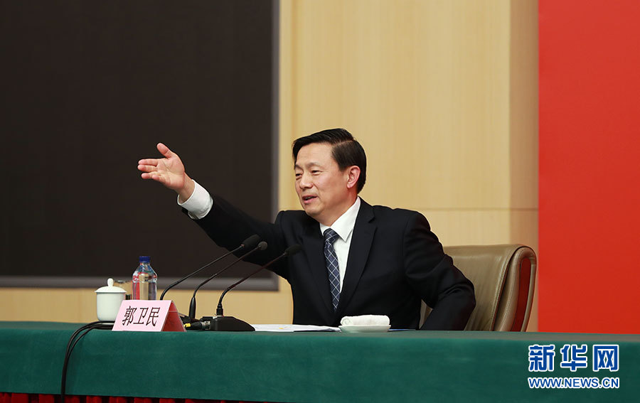 10月23日,十九大新聞中心舉辦記者招待會,邀請中央財經(jīng)領(lǐng)導小組辦公室副主任楊偉民,環(huán)境保護部黨組書記、部長李干杰介紹踐行綠色發(fā)展理念,建設(shè)美麗中國有關(guān)情況,并回答記者提問。圖為主持人郭衛(wèi)民。新華網(wǎng) 郝廣鵬攝
