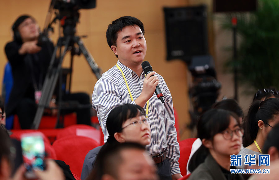 10月23日,十九大新聞中心舉辦集體采訪活動,主題為“打好生態環保攻堅戰”。圖為中國國際廣播電臺記者提問。新華網 郝廣鵬攝