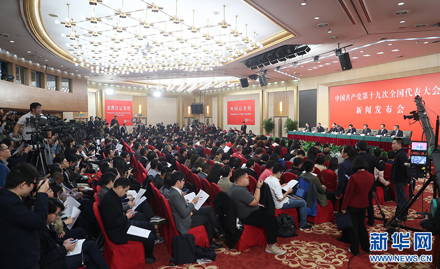 10月26日上午10:00,中國共產(chǎn)黨第十九次全國代表大會新聞發(fā)言人在梅地亞賓館二層新聞發(fā)布廳召開專題新聞發(fā)布會,請有關(guān)方面負(fù)責(zé)人解讀十九大報告,并回答記者關(guān)心的問題。圖為新聞發(fā)布會現(xiàn)場。新華網(wǎng) 王翰林 攝