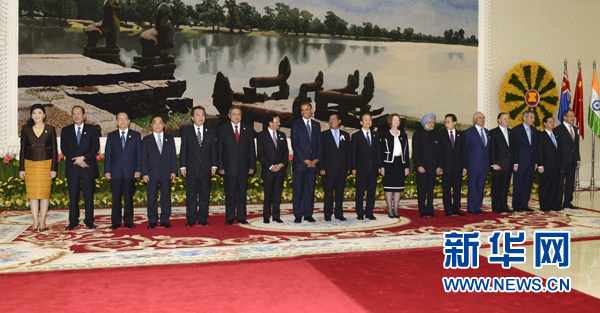 ??? 11月20日,第七屆東亞峰會在柬埔寨金邊舉行。中國國務院總理溫家寶與東亞峰會其他成員國領導人共同出席。這是與會領導人在會前合影。新華社記者 張鐸 攝