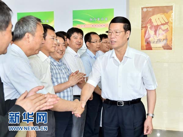 ??? 6月5日,中共中央政治局常委、國務院副總理張高麗到中國環境科學研究院和中國環境監測總站調研。這是張高麗與科技工作者親切握手交談。新華社記者 李濤 攝
