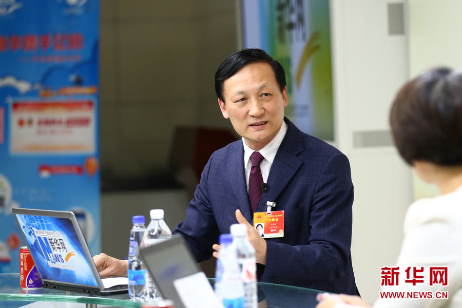 2015年3月13日,全國人大代表,北京大學(xué)第三醫(yī)院骨科主任及脊柱外科研究所所長劉忠軍做客新華會客廳。圖為劉忠軍與主持人交談。新華網(wǎng) 李江 攝
