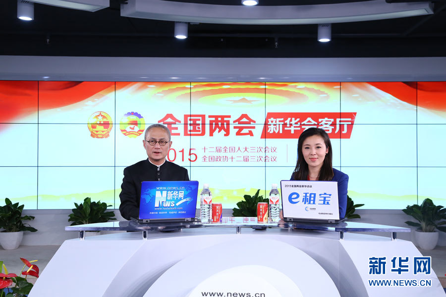 ??? 2015年3月14日,全國人大代表、鳳凰古城文化旅游投資股份有限公司董事長葉文智做客新華會客廳。圖為嘉賓與主持人合影。新華網(wǎng) 李江 攝