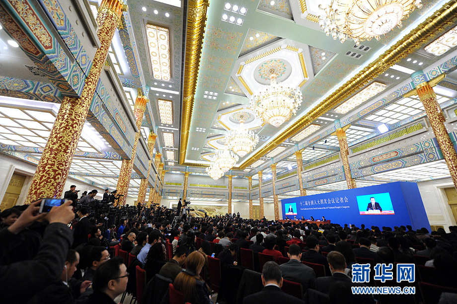 3月16日上午,國務院總理李克強在人民大會堂三樓金色大廳會見采訪十二屆全國人大四次會議的中外記者并回答記者提出的問題。圖為記者會進行中。新華網/中國政府網 陳競超 攝