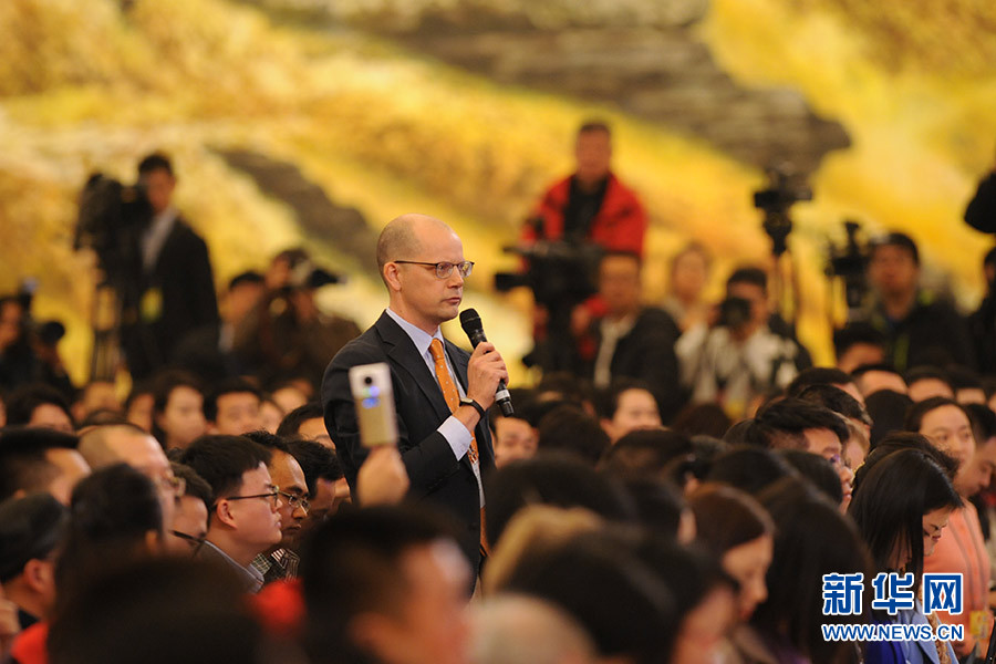 3月16日上午,國務院總理李克強在人民大會堂三樓金色大廳會見采訪十二屆全國人大四次會議的中外記者并回答記者提出的問題。圖為彭博新聞社記者提問。新華網/中國政府網 陳杰攝
