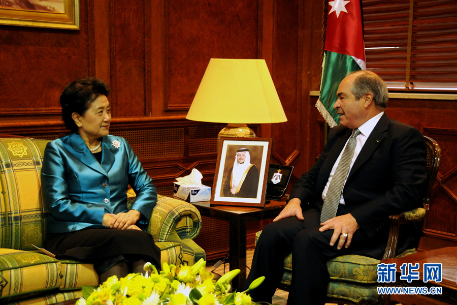 4月20日,在約旦首都安曼,約旦首相兼國防大臣穆勒吉(右)會(huì)見中國國務(wù)院副總理劉延?xùn)|。 新華社記者林曉蔚攝