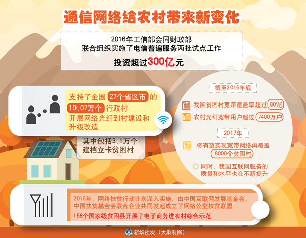 近年來(lái),我國(guó)加大對(duì)中西部地區(qū)和農(nóng)村貧困地區(qū)移動(dòng)互聯(lián)網(wǎng)基礎(chǔ)設(shè)施建設(shè)的投資力度,加快推進(jìn)貧困地區(qū)網(wǎng)絡(luò)全覆蓋,著力降低貧困群眾享受信息生活門檻。截至2016年底,我國(guó)貧困村寬帶覆蓋率超過(guò)80%,農(nóng)村光纖寬帶用戶超過(guò)7400萬(wàn)戶。今年將有望實(shí)現(xiàn)寬帶網(wǎng)絡(luò)再覆蓋8000個(gè)貧困村。同時(shí),我國(guó)互聯(lián)網(wǎng)服務(wù)的質(zhì)量和水平也在不斷提升。