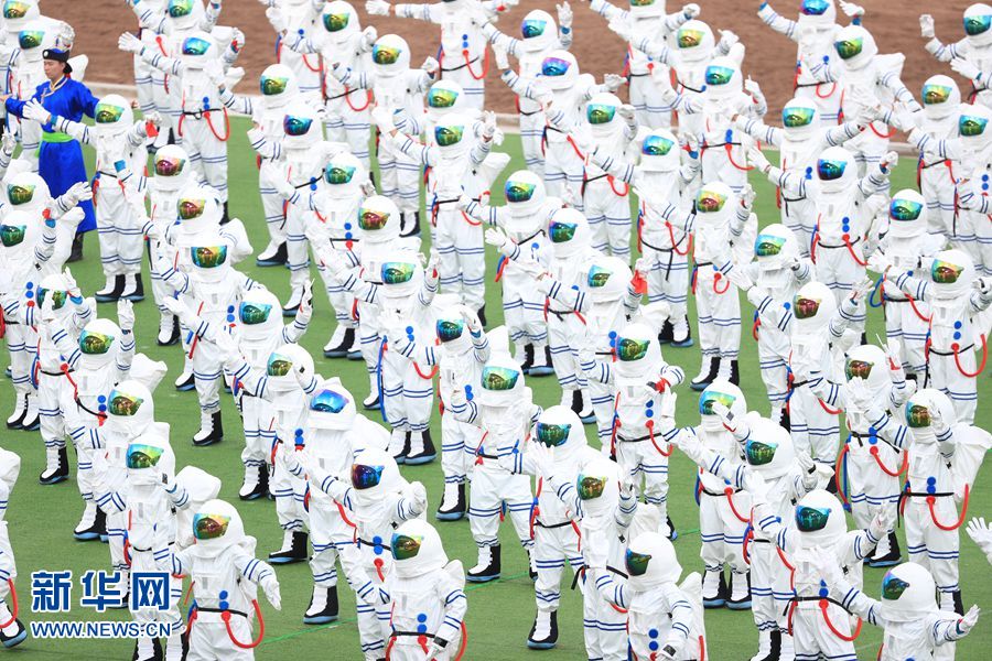 8月8日,內蒙古自治區(qū)成立70周年慶祝大會在呼和塔拉內蒙古少數民族群眾文化體育運動中心舉行。圖為群眾行進表演。新華網記者 陳杰 攝
