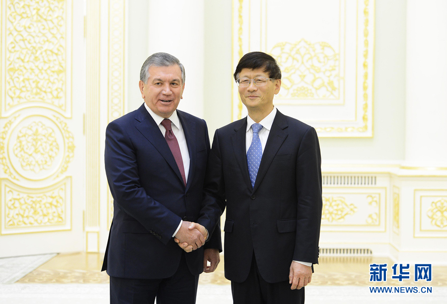9月9日,中共中央政治局委員、中央政法委書記、中國和烏茲別克斯坦政府間合作委員會中方主席孟建柱(右)在塔什干會見烏總統(tǒng)米爾濟約耶夫。 新華社記者沙達提攝