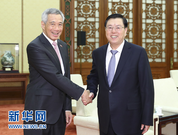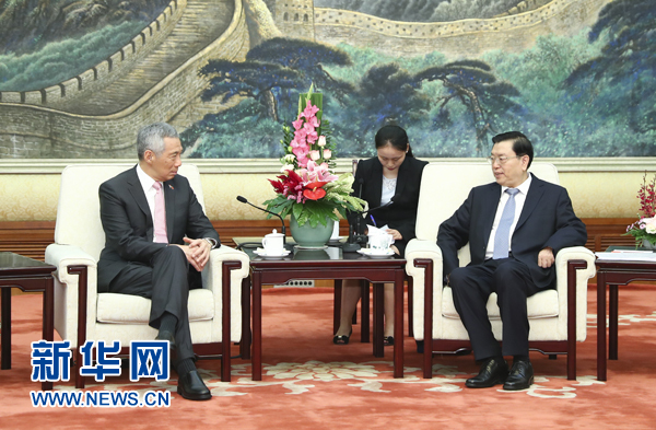 9月20日,中共中央政治局常委、全國人大常委會(huì)委員長張德江在北京會(huì)見新加坡總理李顯龍。 新華社記者 謝環(huán)馳 攝