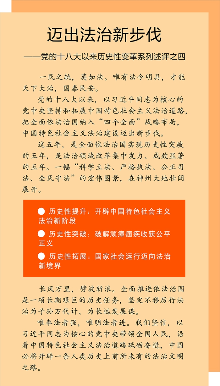 這五年,是全面依法治國實現歷史性突破的五年,是法治領域改革集中發力、成效顯著的五年。一幅“科學立法、嚴格執法、公正司法、全民守法”的宏偉圖景,在神州大地壯闊展開。