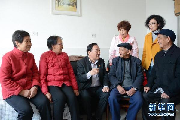 11月2日,十九大代表亓慶良在醫院養老中心與老人們交流參加十九大的心得體會。新華社發(陳穎攝)
