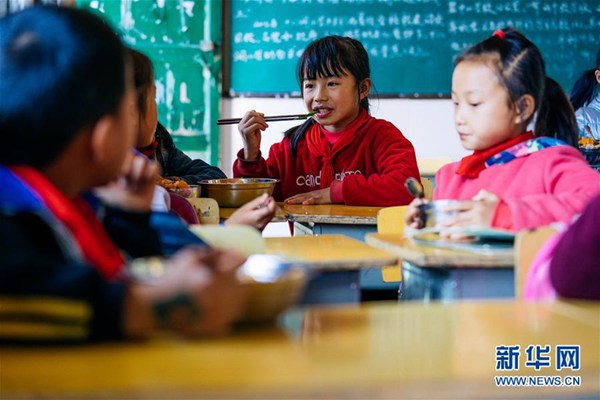 11月8日,湖南省花垣縣十八洞小學(xué)學(xué)生在教室吃午餐。 新華社記者 劉金海 攝