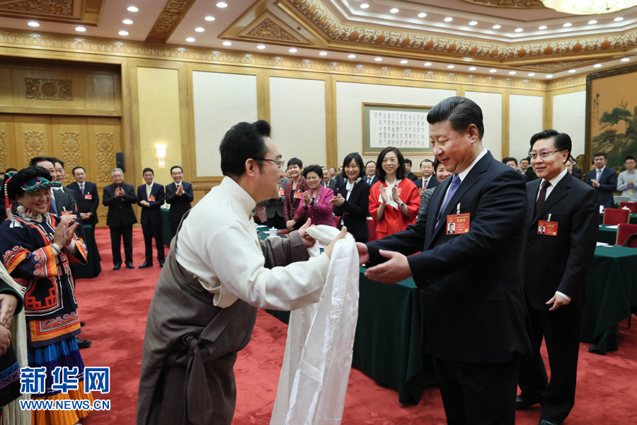 2017年3月8日,習(xí)近平參加十二屆全國(guó)人大五次會(huì)議四川代表團(tuán)的審議。習(xí)近平走進(jìn)會(huì)場(chǎng)時(shí),身著民族服裝的藏族、彝族、羌族代表向總書(shū)記問(wèn)好。這是藏族代表獻(xiàn)上潔白的哈達(dá)。新華社記者蘭紅光攝