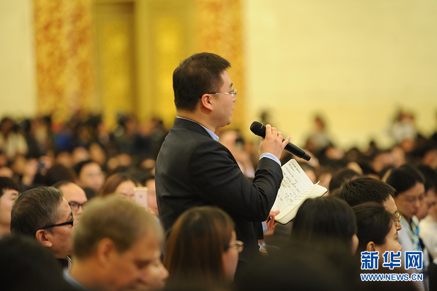3月15日上午,國務院總理李克強在人民大會堂三樓金色大廳會見采訪十二屆全國人大五次會議的中外記者并回答記者提出的問題。圖為中央人民廣播電臺記者提問。新華網(wǎng)/中國政府網(wǎng) 翟子赫 攝?