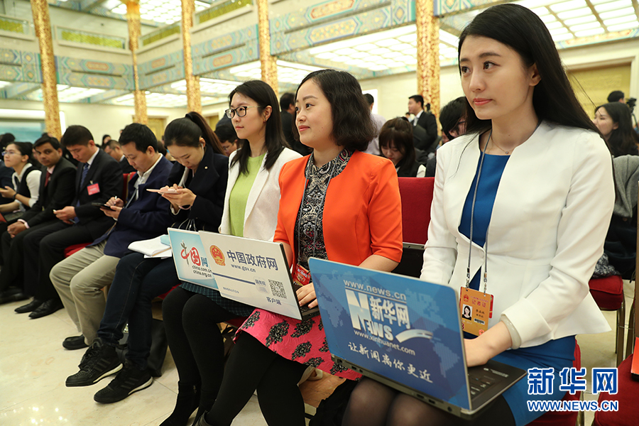 3月15日上午,國務院總理李克強在人民大會堂三樓金色大廳會見采訪十二屆全國人大五次會議的中外記者并回答記者提出的問題。圖為新華網記者在記者會現場。新華網/中國政府網 翟子赫 攝?