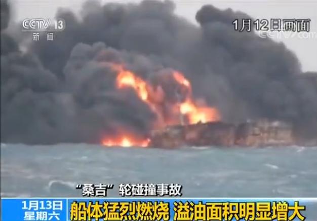 “桑吉”輪碰撞事故:船體猛烈燃燒 溢油面積明顯增大