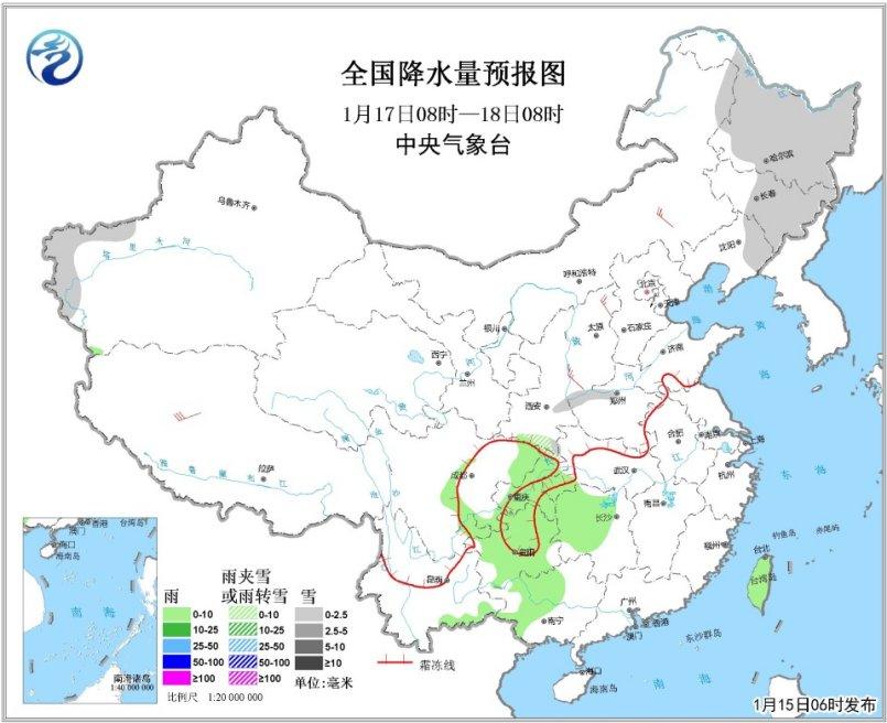全國降水量預報圖(1月17日08時-18日08時)