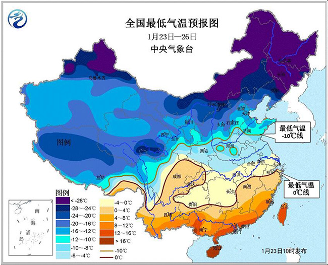 1月23日至月底,影響我國的冷空氣頻繁且勢力較強(qiáng)。23-26日,受強(qiáng)冷空氣影響,中東部大部地區(qū)自北向南先后有4~5級(jí)偏北風(fēng),陣風(fēng)6~7級(jí);黃淮及其以南地區(qū)氣溫下降6~8℃,部分降溫幅度可達(dá)10~12℃。在此期間,中東部大部地區(qū)日平均氣溫較常年同期偏低2~5℃,部分地區(qū)偏低6℃以上。最低氣溫0℃線將南壓至浙江北部、江西北部、湖南南部至貴州南部一線,-10℃線位于甘肅東南部、陜西中部到河北南部、山東中部一線。我國東部和南部海區(qū)先后有6~8級(jí)、陣風(fēng)9~10級(jí)大風(fēng)。